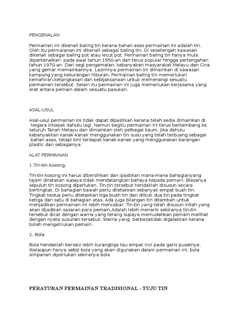 Peraturan permainan tradisional melayu baling tin. Dua kumpulan akan bermain dalam tiap satu perlawanan. ASAL-USUL PERMAINAN Permainan ini dikenali sebagai baling tintuju pot dan bola cetong. Komen dan maklum balas.